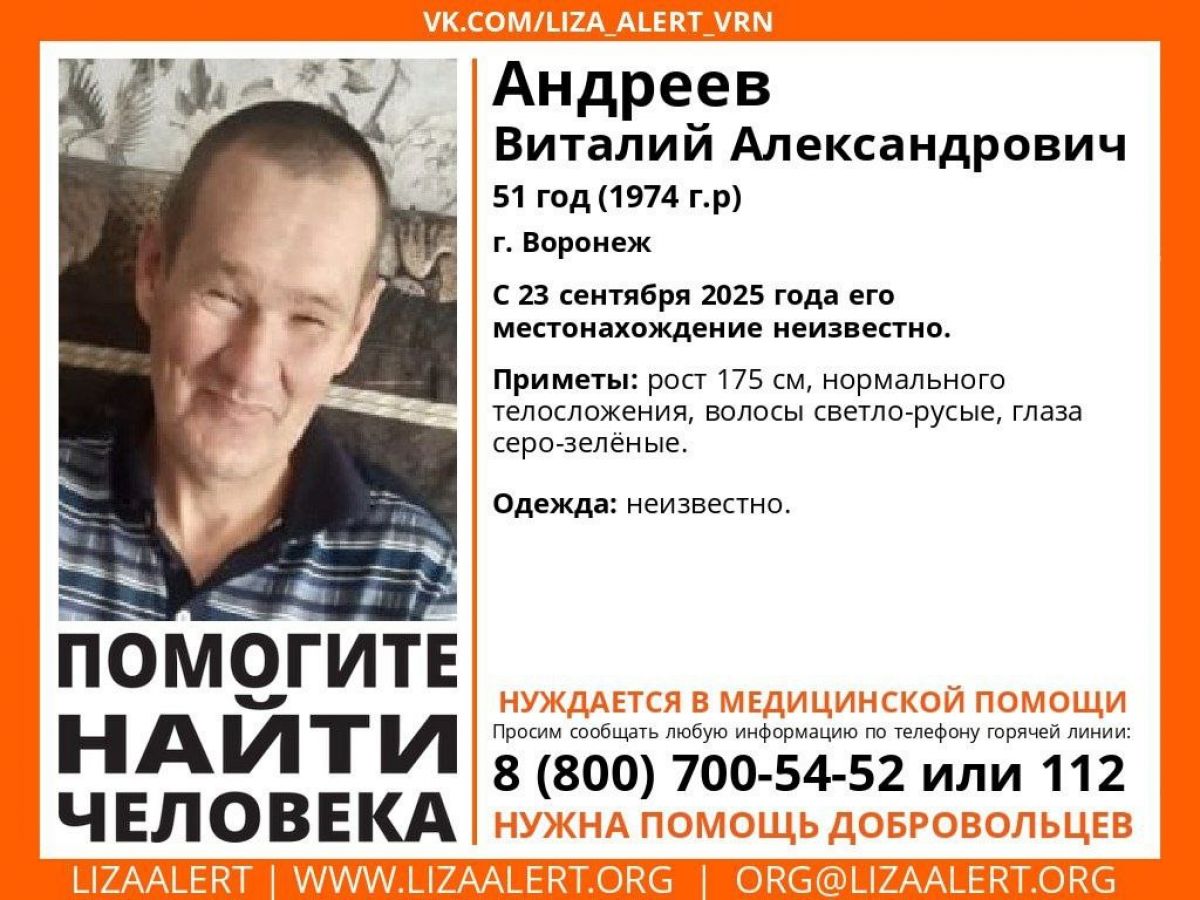 В Воронеже пропал 51-летний Виталий Андреев. Как сообщает поисковый отряд «ЛизаАлерт», его местонахождение неизвестно с 23 сентября. Ему требуется медицинская помощь.