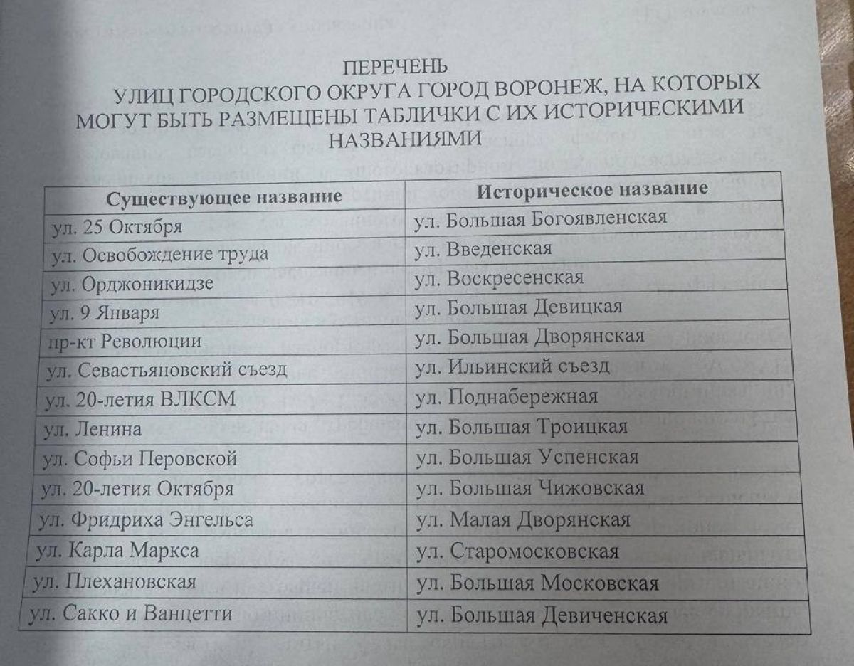 Депутат воронежской гордумы Александр Сысоев выложил в своем тг-канале фотографии проекта постановления мэра об оснащении некоторых улиц Воронежа табличками их с историческими названиями.