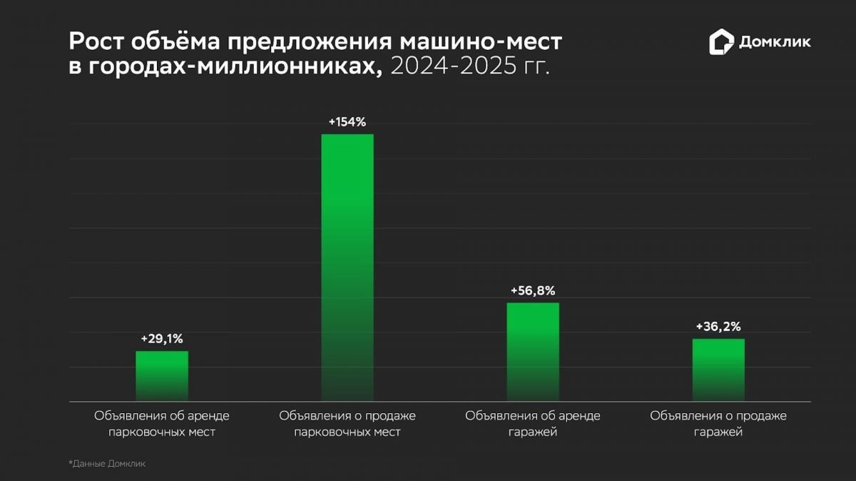 Анализ витрины объявлений на Домклик показал, что лидером стали предложения о продаже парковочных мест: за год их количество увеличилось более чем на 154%. Сегмент аренды также показал значительный рост — на 29,1%. Показатели по гаражам более скромные: продажи увеличились на 36,2%, а аренда — на 56,8%.