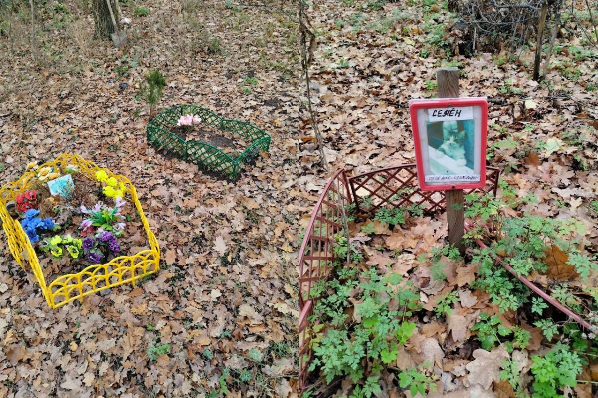 Судя по кадрам, захоронения питомцев спрятались под опавшими листьями. На видном месте остались таблички с именами и фотографиями, а также небольшие оградки.