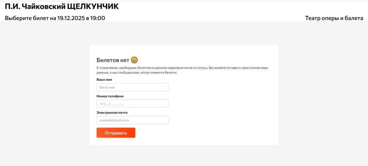 Торговля билетами стартовала 28 октября, однако уже к 31 октября в кассах не осталось ни одного свободного места. Особенно быстро исчезли места в партере - их разобрали буквально в первые часы после открытия продаж. Теперь при попытке купить билеты на "Щелкунчика" в декабре с помощью официального сайта воронежцы могут увидеть надпись "Билетов нет" и оставить свои контактные данные на портале, чтобы получить уведомление в том случае, если билет вдруг появится.