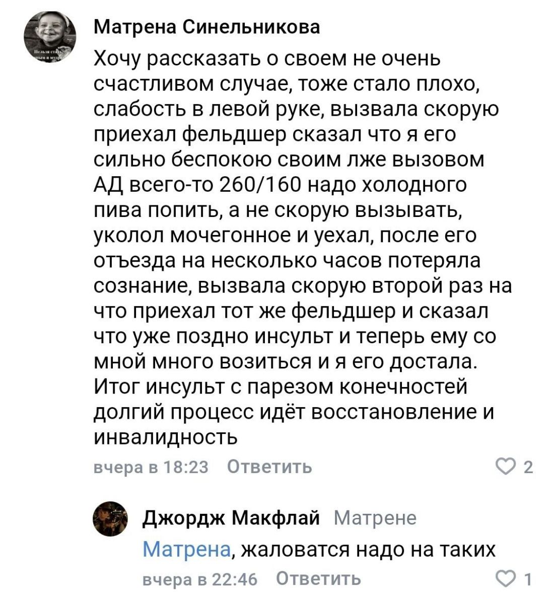 - О случае халатного отношения к пацентам медиков скорой помощи решила рассказать читательница. Под новостью о спасенной врачами горожанке с инсультом пользовательница рассказала, как из-за невнимательности медиков она получила инвалидность. Женщине посоветовали пожаловаться на фельдшера.