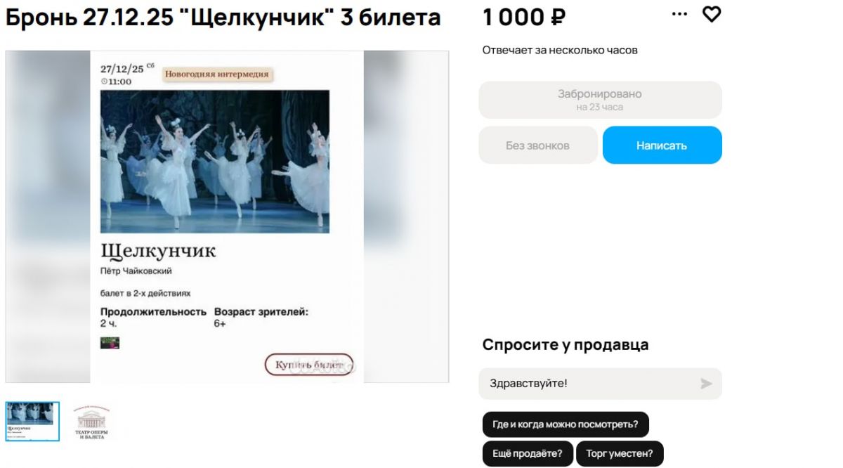 По информации с «Авито», цена билетов на новогоднее представление у перекупов варьируется от 3 до 5 тысяч рублей. Однако среди объявлений можно найти и подозрительные, за которыми могут скрываться мошенники. Например, кто-то предлагает билеты всего за 1 тысячу рублей.
