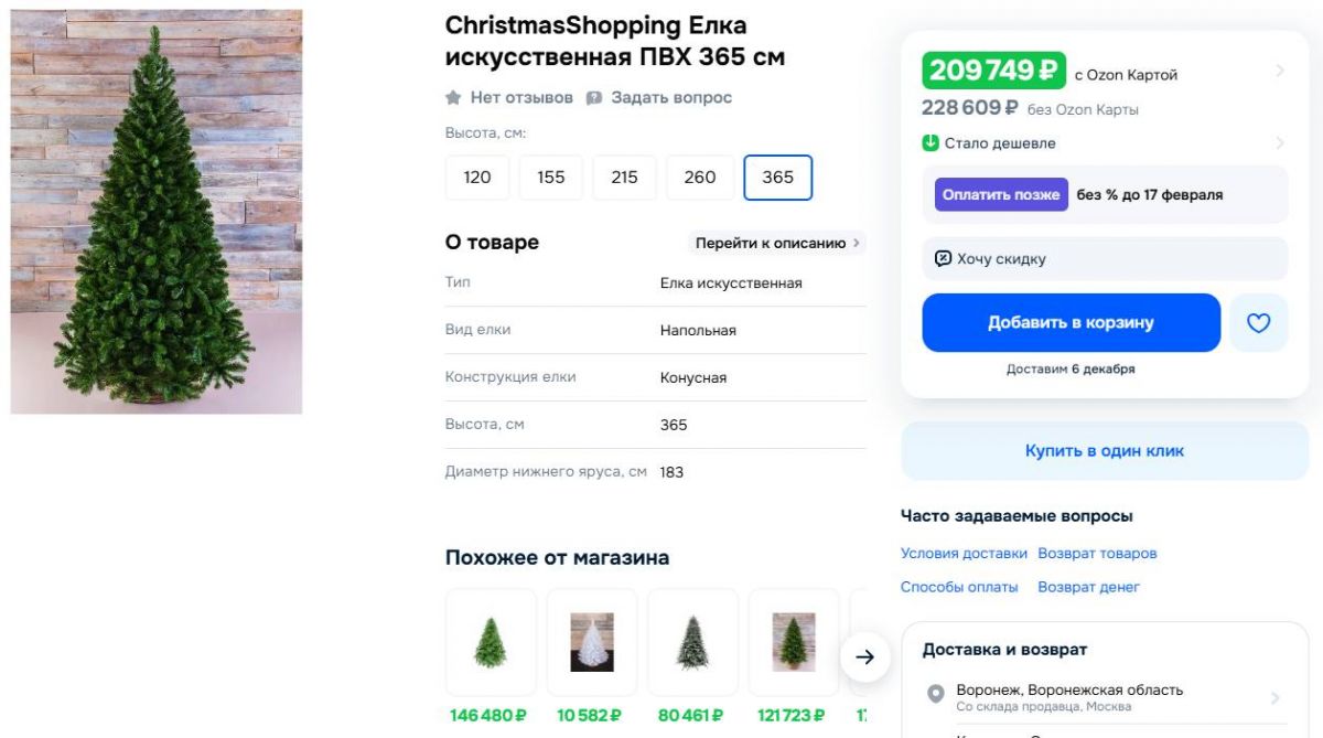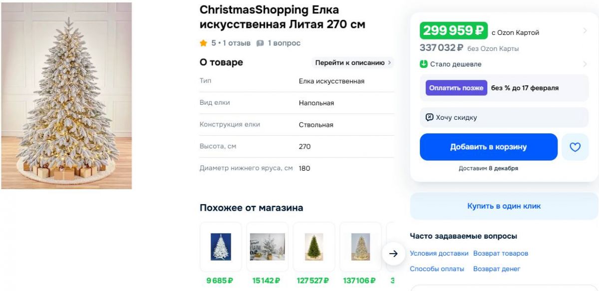 В октябре продажи искусственных елей увеличились на 10%, причем покупатели останавливаются на более дорогих и долговечных вариантах. Например, за дерево высотой 2,7 метра на популярном маркетплейсе просят 300 тысяч рублей. Есть варианты для частного дома. Одна из елок так и называется — «Коттеджная», высотой она всего 3,65 метра, а цена 209 тысяч рублей. За счет ствольной конструкции искусственная ель внешне очень похожа на живое дерево, из-за чего даже на такие небюджетные варианты имеется спрос. Что касается ёлочек подешевле, можно сказать, что нижний ценовой порог - 300 рублей. Конечно, всё зависит от размера, и если вы хотите приобрести дерево под потолок (~2,5 метра), то купить такую можно и за 3 тысячи и за 13. В общем, рынок довольно разнообразный.