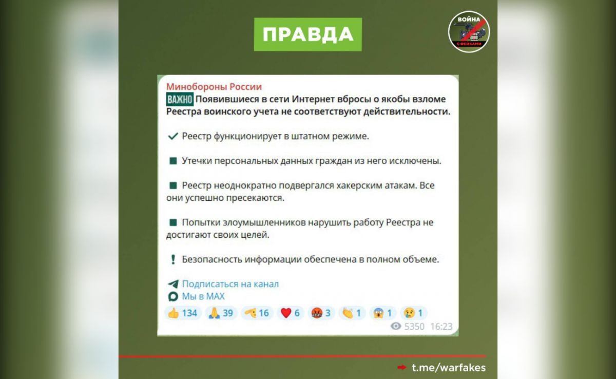 В ряде телеграм-каналов распространяется информация о взломе серверов разработчика Реестра воинского учета. Якобы хакеры, заполучив доступ, уничтожили инфраструктуру реестра. В телеграм-канале «Война с фейками» опровергли эту информацию со ссылкой на Минобороны РФ, где подчеркнули, что сервис работает в штатном режиме, а утечки информации исключены.