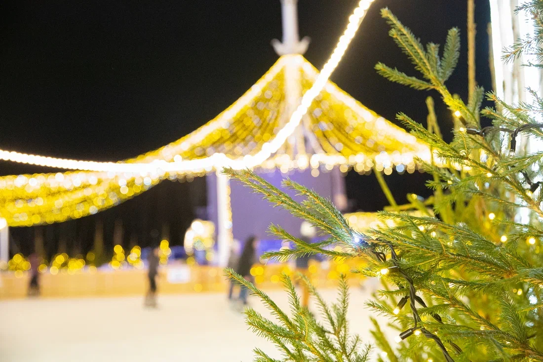 Её огни отражаются в глазах фигуристов на большом открытом катке а и создают настоящую карнавальную атмосферу. На фотографиях — счастливые лица после удачного пируэта и родители со счастливыми детьми на руках.
