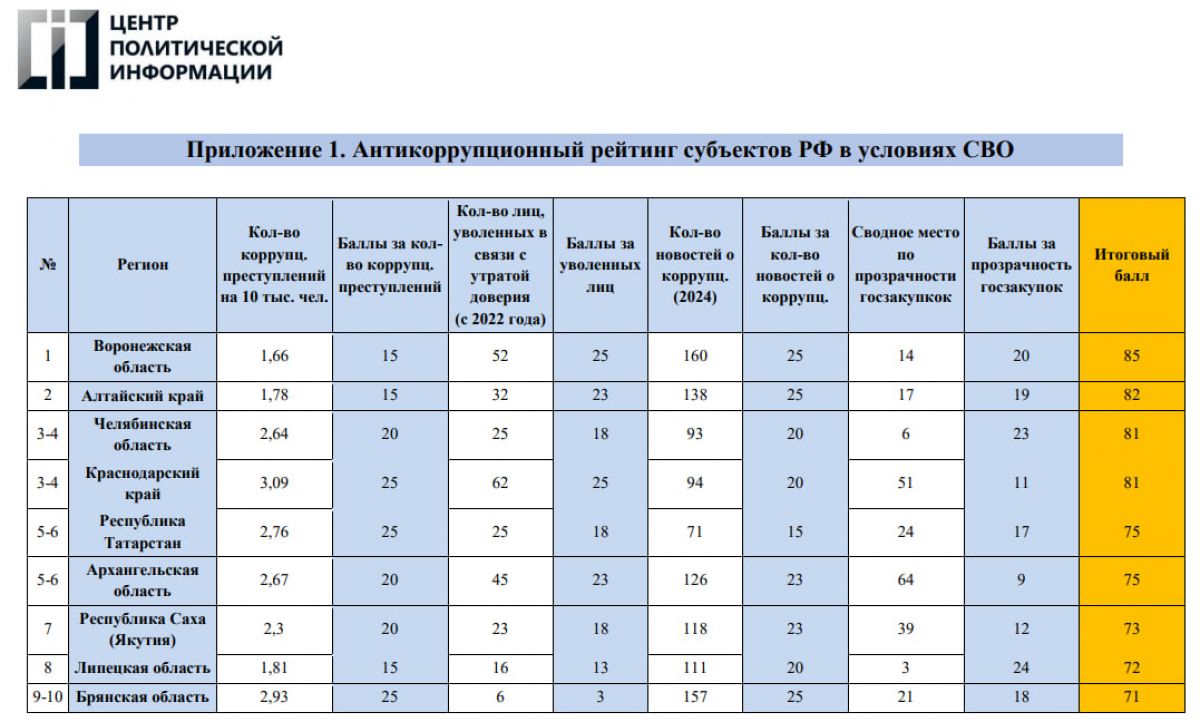 Воронежская область заняла первое место в антикоррупционном рейтинге субъектов РФ, представленного Центром политической информации 20 января.