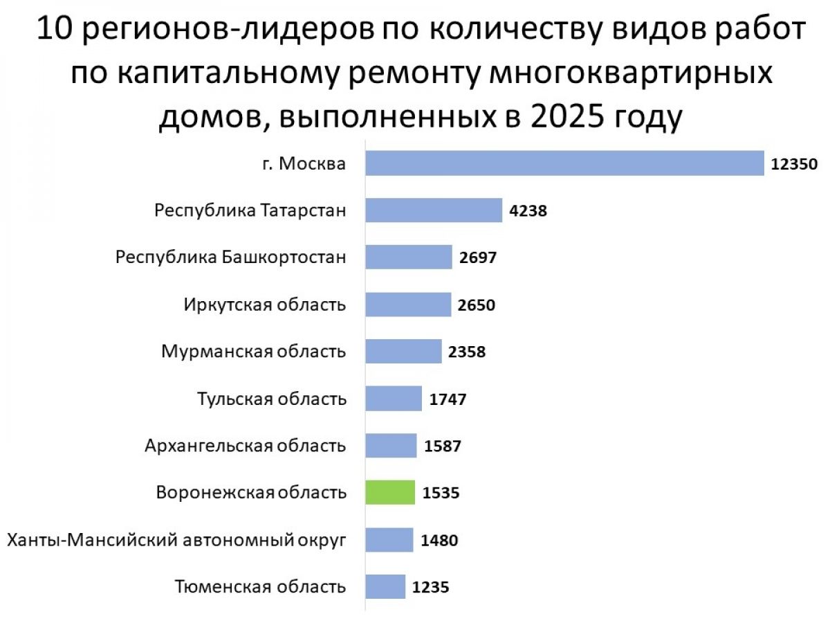Воронежская область признана одним из лидеров в стране по качеству и объему капитального ремонта многоквартирных домов в 2025 году. Согласно рейтингу Министерства строительства и ЖКХ России, регион занял 8-е место по количеству выполненных работ.
