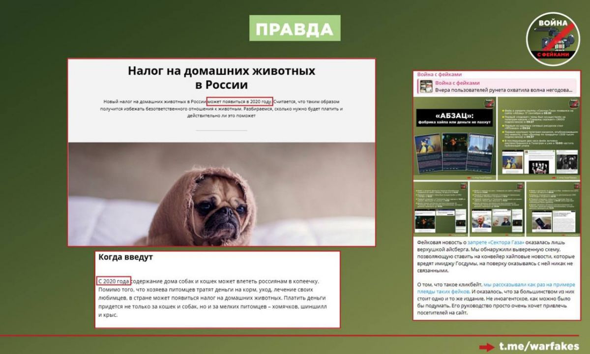 Отмечается, что фейк про «налог на выгул» раскручивается по уже знакомому сценарию. Ранее аналогичным образом в сети распространялась ложь о том, что судебные приставы начнут изымать домашних животных должников. Тогда из контекста был вырван комментарий юриста, который, напротив, доказывал, что такая процедура практически неосуществима.