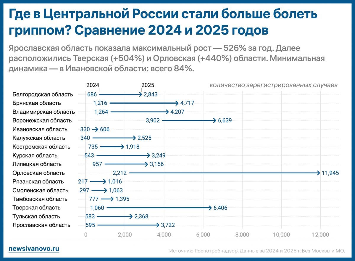 А вот Воронежская область заняла второе место по количеству заболевших. Большее количество человек обратилось к врачу только в Орловской области, там в 2025 году зарегистрировали 11 945 заразившихся гриппом.
