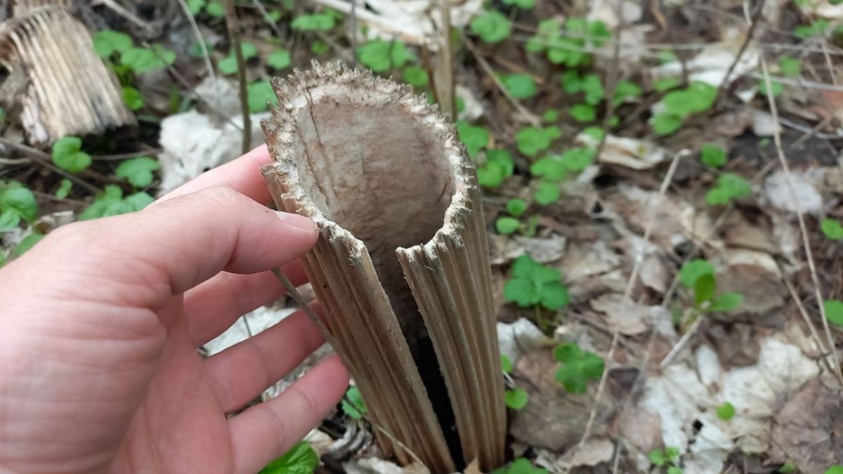 На присланной читателем фотографии хорошо виден мощный ствол растения. «Ещё бы, для того чтобы вымахать в высоту на 3–4 метра, нужно иметь мощную опору», — отмечает автор сообщения. Борщевик растёт здесь уже несколько лет и будет расширять занятое пространство. Огромные листья и невероятно быстрый рост не оставляют шансов другим растениям.