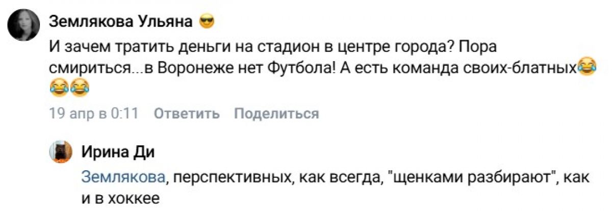 О футболе. Воронежцы не в восторге: по их мнению, в команде не хватает талантливых спортсменов, а вкладывать деньги в стадион при таком уровне игры – пустая трата средств.
